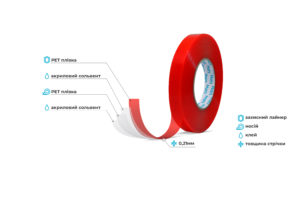 Виготовлення рекламних стендів і вивісок; Монтаж світлодіодних (LED) стрічок; Виробництво самоклеючих матеріалів; Виробництво POS-матеріалів: цінників, тримачів, плакатів, знаків, табличок; Виробництво поліграфічної продукції: етикеток, плакатів, банерів, листівок; Кріплення профілів; Склеювання ПВХ-тканин, банерів і тентів; Виробництво торговельного, холодильного і промислового обладнання, Монтаж панелей і накладок; Зрощування алюмінієвих і пластикових листів; Фіксація направляючих і фурнітури; Приклеювання ущільнювачів в холодильному обладнанні; Виробництво і ремонт меблів; Виробництво декоративних коробочок, Декорування і hand made; Проведення ремонтно-монтажних робіт в автомобільній промисловості; Виробництво рекламно-поліграфічної продукції. Стандартні розміри: Ширина: 4мм, 6мм, 8мм, 9мм, 10мм, 12мм, 15мм, 19мм, 20мм, 25мм Довжина: 50м *можливе виготовлення роликів за індивідуальними параметрами