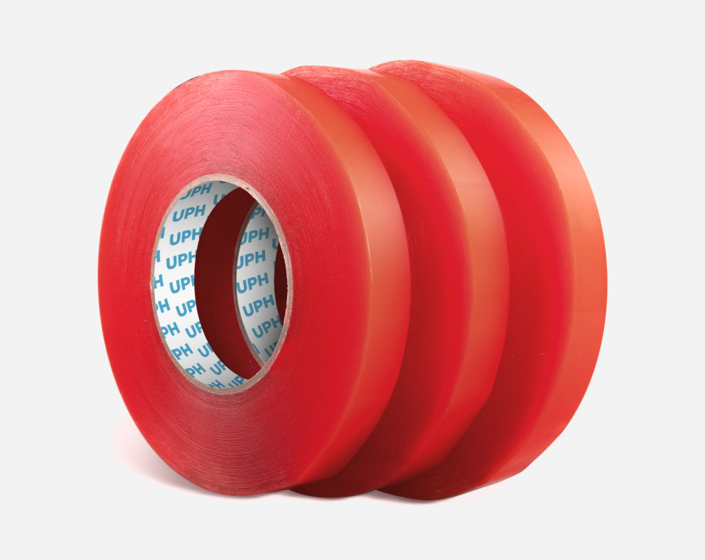 Двосторонній плівковий скотч PET/SOL виготовлений з прозорої ПЕТ-плівки на яку з обох боків нанесений клейовий шар на основі модифікованого акрилу. Завдяки товщині 0,21мм стрічка утворює надтонке і непомітне з’єднання. Двостороння прозора клейка PET стрічка має надвисокий рівень початкової адгезії, котра забезпечує миттєве міцне з’єднання поверхонь, стійке до механічних зрушень та на зсув. Має відмінну адгезію до матеріалів з обробленого дерева, алюмінію, пластиків, ПВХ, акрилу, полікарбонату, полістиролу, АБС-пластику, поліестеру, деяких видів ПЕ і ПП, скла, картону, паперу, плівок, ПВХ-тканин тощо. Плівкова клейка стрічка PET/SOL має високий рівень термостійкості -20 до +120°С, стійка до УФ-випромінювання, дії пластифікаторів, вологи та пару, призначена для використання всередині та ззовні приміщень. Двосторонній тонкий ПЕТ-скотч від TM UPH призначений для довгострокового склеювання рівних поверхонь.